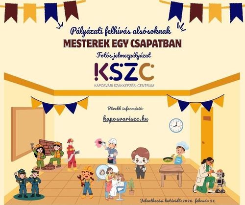 A Kaposvári Szakképzési Centrum pályázatot hirdet az általános iskolák alsó tagozatos osztályai számára, „Mesterek egy csapatban” címmel. A verseny célja, hogy a tanulók játékos és alkotó módon fedezzék fel a szakmák izgalmas, sokszínű világát.